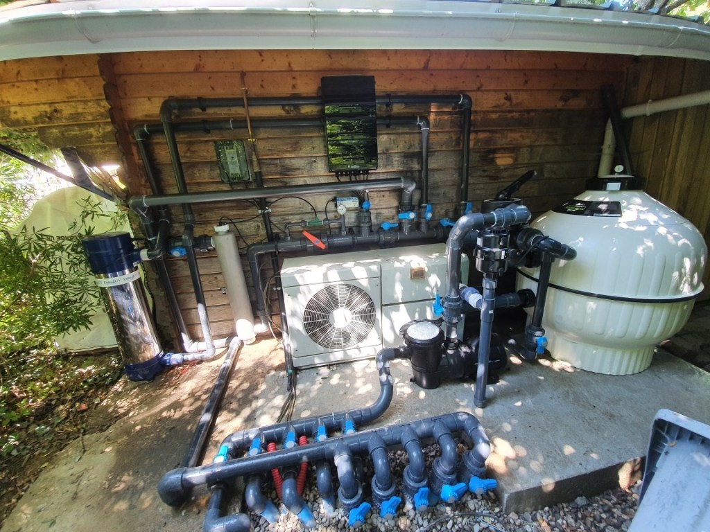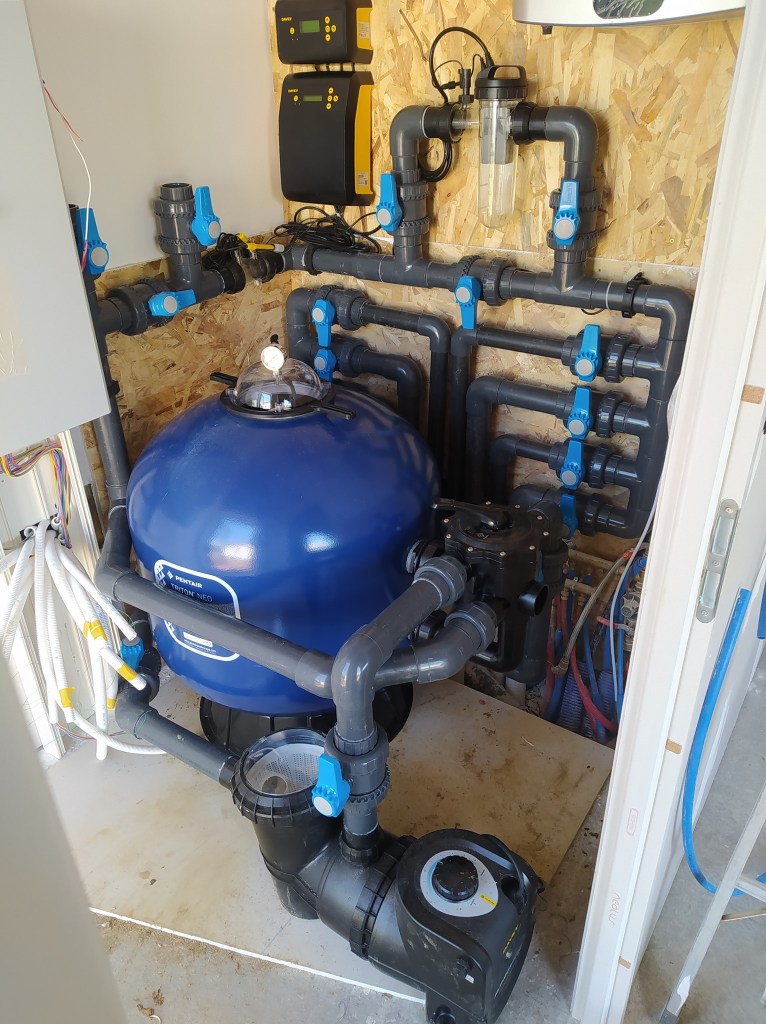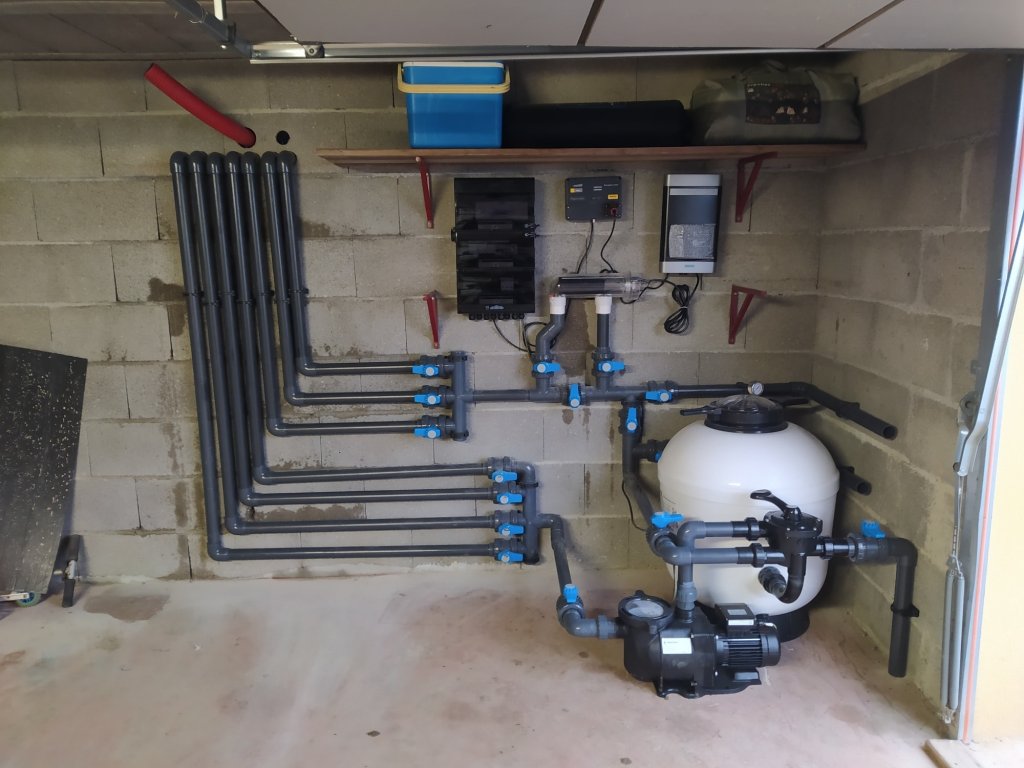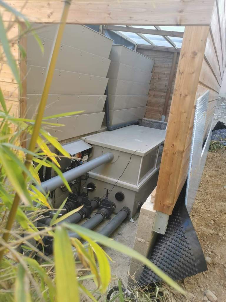 Filtration gravitaire avec filtre à douche pour bassin à koï 60m3